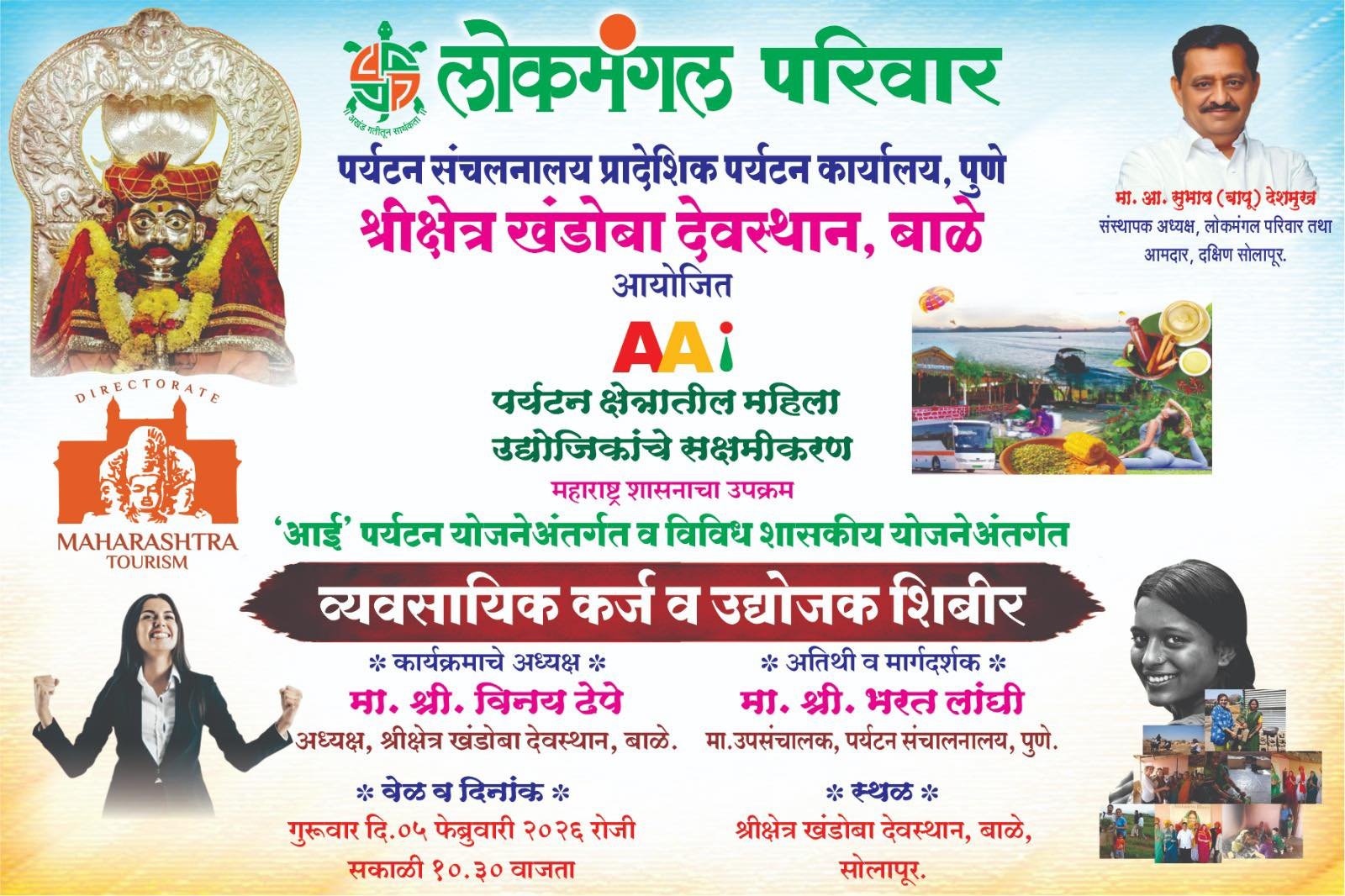 महिलांच्या आर्थिक स्वावलंबनाला चालना देण्यासाठी आणि पर्यटन क्षेत्रातील उद्योजक संधी उपलब्ध करून देण्याच्या उद्देशाने लोकमंगल परिवाराच्या पुढाकारातून, पर्यटन संचालनालय प्रादेशिक पर्यटन कार्यालय पुणे व श्रीक्षेत्र खंडोबा देवस्थान, बाळे यांच्या संयुक्त विद्यमा नाने ‘आई पर्यटन’ योजनेअंतर्गत महिला उद्योजकांसाठी व्यवसायिक कर्ज व उद्योजक शिबिराचे आयोजन करण्यात आले आहे.