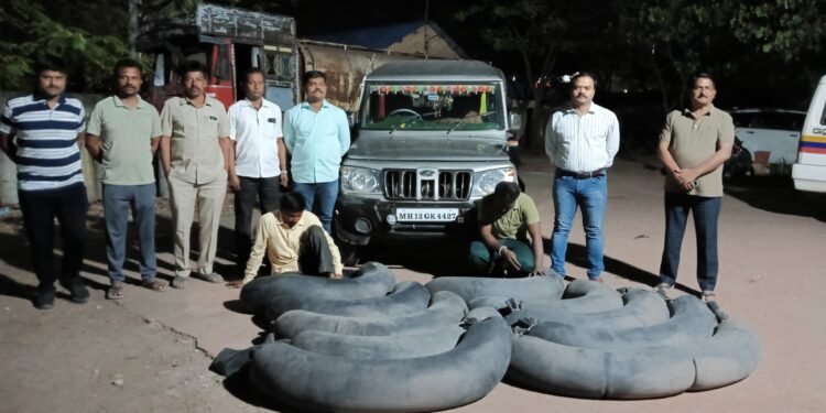 सविस्तर वृत्त असे की, लोकसभा निवडणुकीच्या पार्श्वभूमीवर राज्य उत्पादन शुल्क विभागाकडून जिल्हाभरात छापा सत्र सुरू करण्यात आले असून राबविलेल्या विशेष मोहिमेत निरीक्षक नंदकुमार जाधव यांच्या पथकाने गुरुवारी रात्री नऊ वाजण्याच्या सुमारास सोलापूर- तुळजापूर रोडवरील गंगेवाडी (ता. उत्तर सोलापूर) परिसरात बोलेरो जीप क्रमांक MH 12 GK 4427 या वाहनातून दहा रबरी ट्यूबमध्ये अंदाजे बाराशे लिटर हातभट्टी दारूची वाहतूक करतांना आढळून आल्याने समर्थ मोहन पवार, वय 24 वर्षे व कोंडीबा शिवाजी राठोड, वय 47 वर्षे या दोन इसमांना अटक करण्यात आली.
