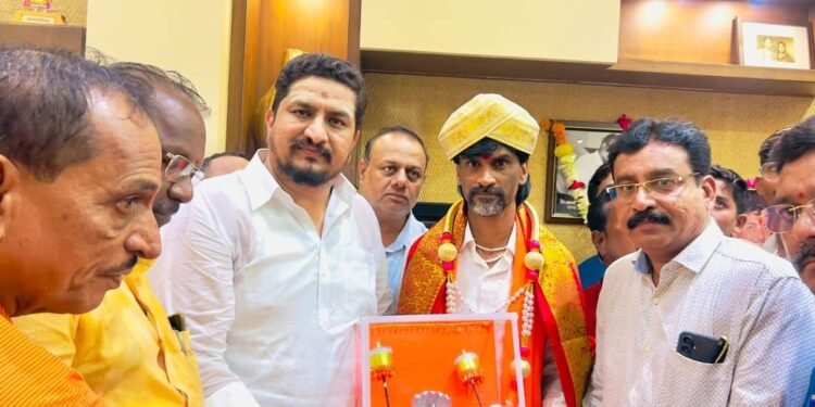 सोलापूर, दि. :- मराठा आरक्षण संघर्षयोद्धा मनोजदादा जरांगे पाटील यांच्या सुरू असलेल्या मराठा आरक्षणासंदर्भातील आंदोलनाला अखिल भारतीय वीरशैव लिंगायत समाजाने पाठिंबा जाहीर केला आहे. काल सोलापूरमध्ये जरांगे पाटील यांच्या ‘शांतता यात्रे’ दरम्यान वीरशैव लिंगायत महासभेचे राष्ट्रीय उपाध्यक्ष सुदीप चाकोते यांनी त्यांची भेट घेऊन पाठिंब्याचे पत्र त्यांना दिले.