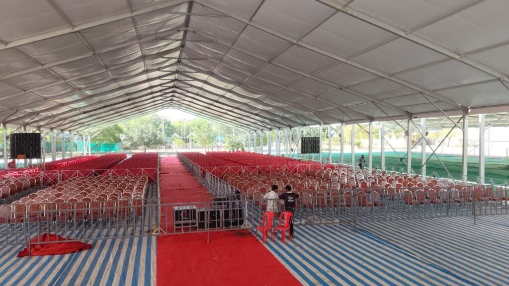 हरीभाई देवकरण मैदानावर 50 फूट स्टेज, भगवा पडदा, हजारोंच्या बैठकीची व्यवस्था