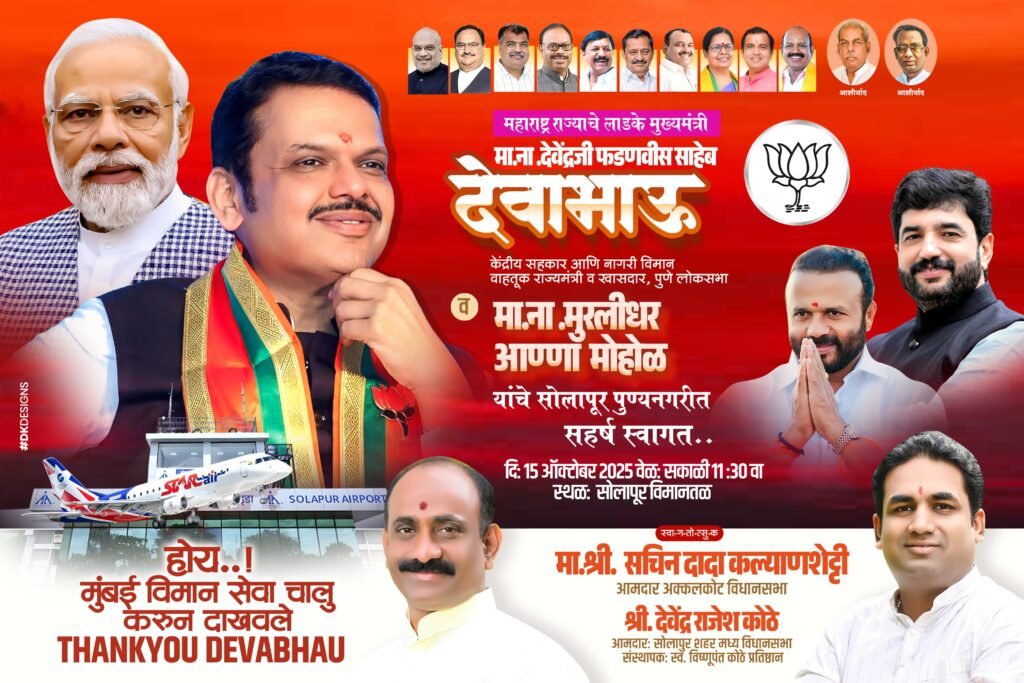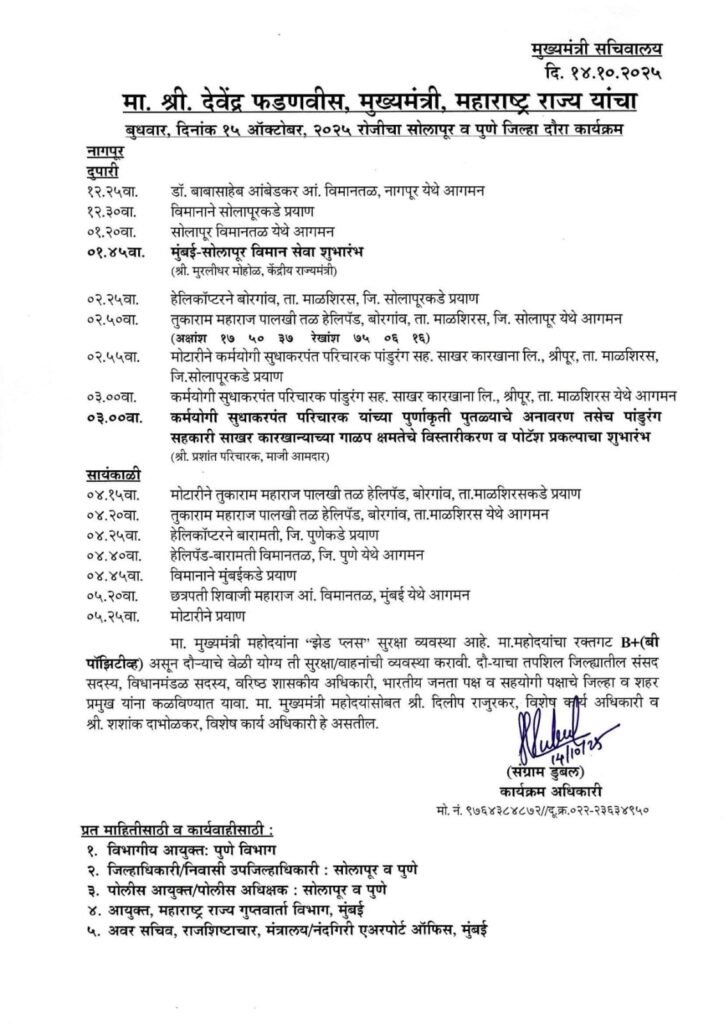 सोलापूर, दि. १४ ऑक्टोबर — महाराष्ट्राचे मुख्यमंत्री श्री. देवेंद्र फडणवीस हे बुधवार, दि. १५ ऑक्टोबर २०२५ रोजी सोलापूर आणि पुणे जिल्ह्याच्या दौऱ्यावर येणार आहेत.