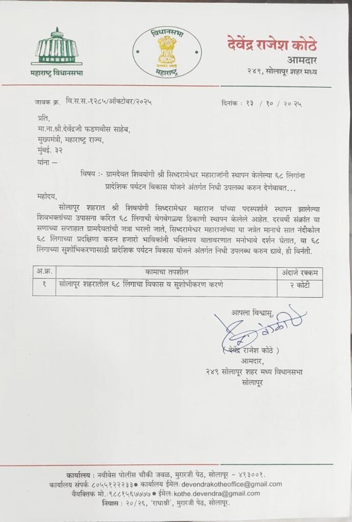 ग्रामदैवत शिवयोगी श्री सिद्धरामेश्वरांनी स्थापन केलेल्या ६८ लिंगांच्या जिर्णोद्धारासाठी आमदार देवेंद्र कोठे यांच्या सातत्यपूर्ण पाठपुराव्याला यश मिळाले आहे. मुख्यमंत्री देवेंद्र फडणवीस यांनी या महत्त्वपूर्ण धार्मिक आणि पर्यटन विकास प्रकल्पासाठी २ कोटी रुपयांचा निधी मंजूर केला आहे.याचबरोबर, शहर मध्य विधानसभा मतदारसंघाच्या विकासासाठी १४ कोटी रुपयांचा विशेष निधी देऊन मुख्यमंत्री फडणवीस यांनी पुन्हा एकदा आमदार कोठेंवर आपली मर्जी दाखवली आहे.