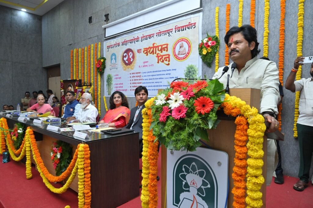 शुक्रवारी, पुण्यश्लोक अहिल्यादेवी होळकर सोलापूर विद्यापीठाचा 21 वा वर्धापन दिन समारंभ थाटात साजरा झाला. प्रारंभी सकाळी आठ वाजता कुलगुरू प्रा. डॉ. प्रकाश महानवर यांच्या हस्ते ध्वजारोहणाचा कार्यक्रम पार पडला. त्यानंतर सकाळी दहा वाजता विद्यापीठाच्या मुख्य सभागृहात पुरस्कार वितरण सोहळा पार पडला. या समारंभास मुख्य अतिथी म्हणून नॅशनल एज्युकेशन टेक्नॉलॉजी फोरम, नवी दिल्लीचे अध्यक्ष प्रा. डॉ. अनिल सहस्त्रबुद्धे यांनी मार्गदर्शन केले. यावेळी आमदार श्री गोपीचंद पडळकर, एचएसएनसी मुंबई विद्यापीठाच्या कुलगुरू डॉ. हेमलता बागला यांची प्रमुख उपस्थिती होती. विद्यापीठाचे प्र-कुलगुरु प्रा. डॉ. लक्ष्मीकांत दामा यांनी कार्यक्रमाचे प्रास्ताविक व स्वागत केले. यावेळी प्रभारी कुलसचिव डॉ. अतुल लकडे यांनी विद्यापीठाच्या प्रगतीचा आढावा घेतला. यावेळी पुण्यश्लोक अहिल्यादेवी होळकर सोलापूर विद्यापीठाचा यंदाचा प्रतिष्ठेचा व मानाचा जीवनगौरव पुरस्कार पंढरपूर येथील पालवी संस्थेच्या संस्थापिका श्रीमती मंगलताई शहा यांना सन्मानपूर्वक प्रदान करण्यात आला. रोख 51 हजार रुपये, स्मृतिचिन्ह, गौरवपत्र, शाल, श्रीफळ असे या पुरस्काराचे स्वरूप होते. यावेळी विविध पुरस्कारांचेही वितरण करण्यात आले. यावेळी जीवन गौरव पुरस्कार मानपत्राचे वाचन सहायक कुलसचिव डॉ. शिवाजी शिंदे यांनी केले.