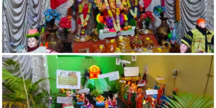 शहरातील बाळे भागातील सामाजिक कार्यकर्ता सौरभ सुरवसे यांनी आपल्या भावाच्या आणि बहिणीच्या मदतीने लाडकी बहीण योजनेचा देखावा सादर केला आहे.
