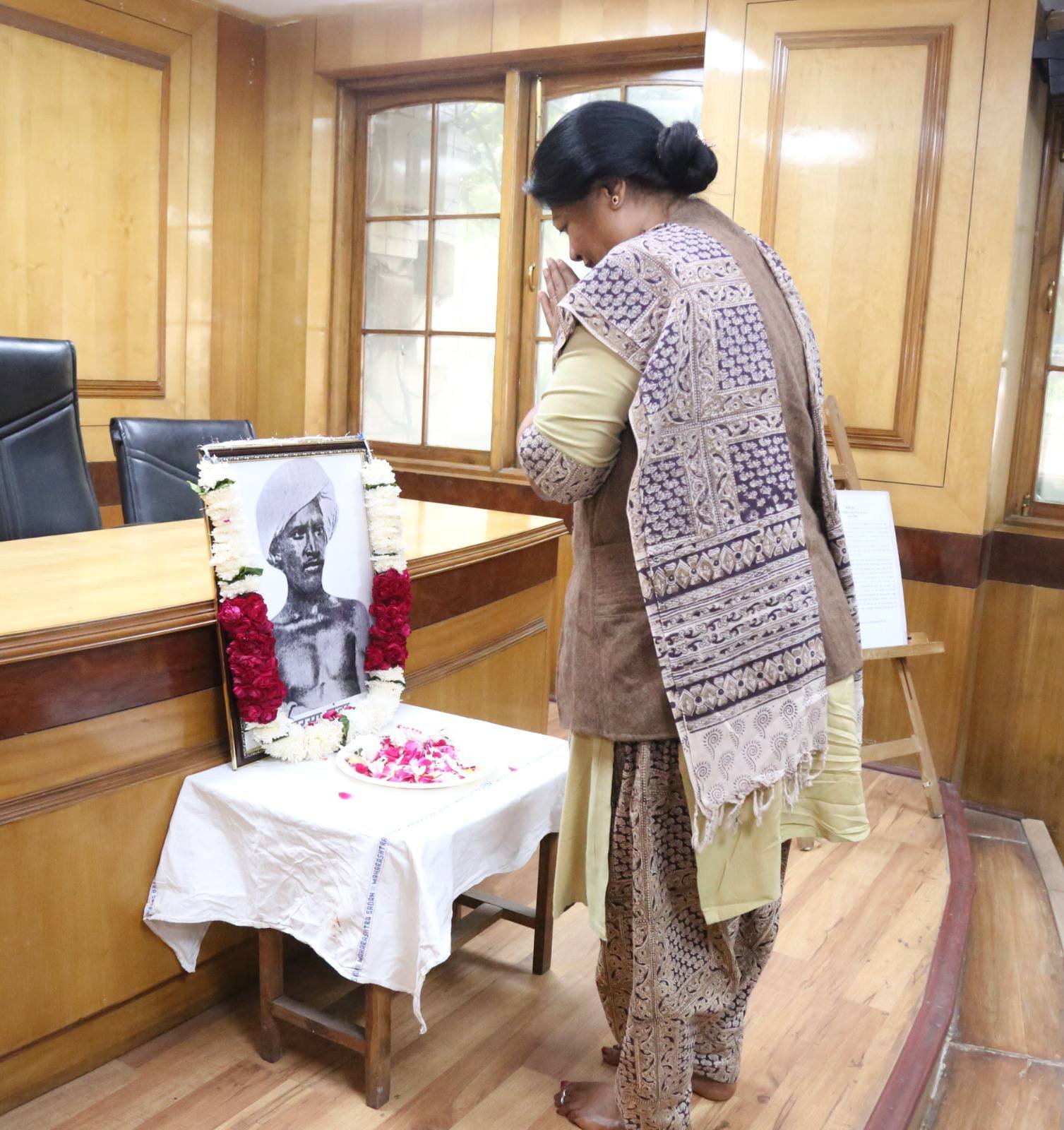 नवी दिल्ली, १५: आदिवासी समाजक्रांतीचे जनक व स्वातंत्र्यसेनानी बिरसा मुंडा यांच्या १५० व्या जयंतीनिमित्त निवासी आयुक्त तथा सचिव आर विमला यांनी जुने महाराष्ट्र सदन येथे त्यांच्या प्रतिमेस पुष्पांजली वाहून अभिवादन केले.