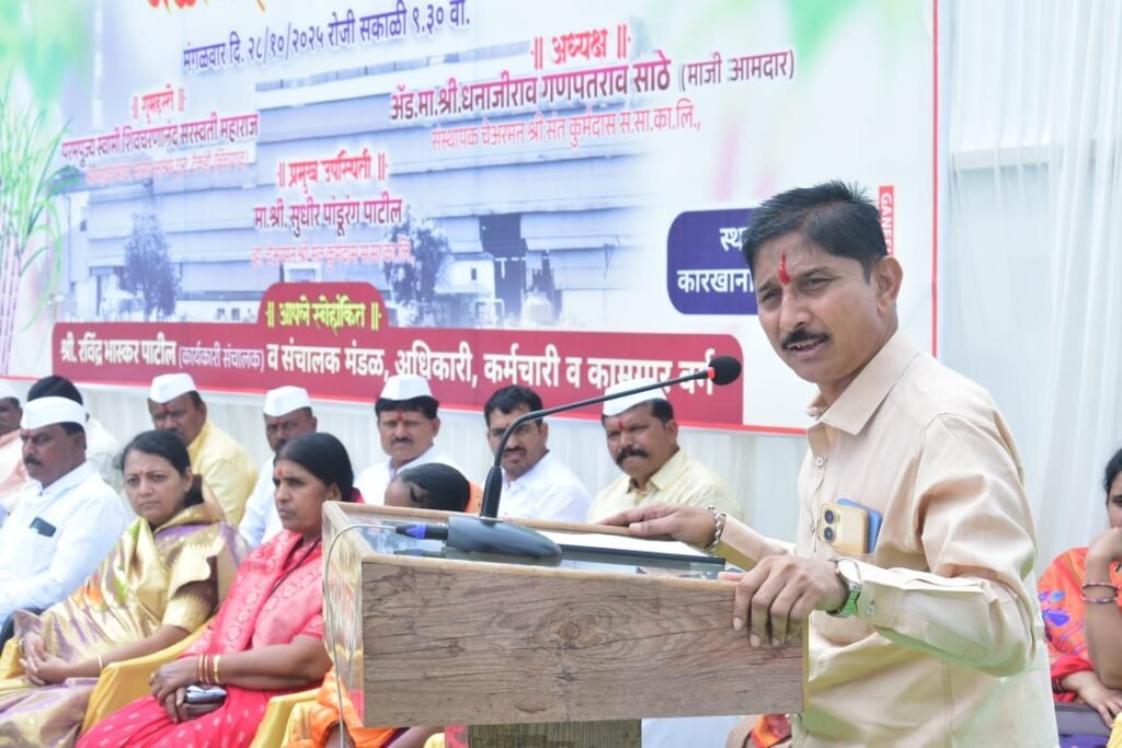 प्रास्ताविकात संचालक दादासाहेब साठे यांनी सांगितले की, “कारखाना अडचणींवर मात करत शेतकऱ्यांच्या विश्वासास पात्र ठरला आहे. चालू हंगामात ३.५० लाख मेट्रिक टन गाळपाचे उद्दिष्ट ठेवले असून त्यासाठी मशिनरी आणि वाहतूक यंत्रणा सज्ज आहे.”