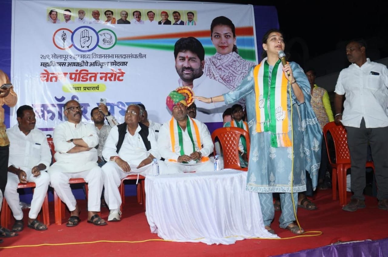 विधानसभा निवडणुकीतील शहर मध्य विधानसभा मतदारसंघातील महाविकास आघाडी अंतर्गत काँग्रेसचे उमेदवार चेतन नरोटे यांच्या प्रचारार्थ इंदिरा नगर येथे सभा झाली. त्याप्रसंगी त्या बोलत होत्या. यावेळी काँग्रेसचे उमेदवार चेतन नरोटे, माजी नगरसेवक रियाज हुंडेकरी आदींसह पदाधिकाऱ्यांची प्रमुख उपस्थिती होती. या सभेला महिलांची मोठी गर्दी दिसून आली.