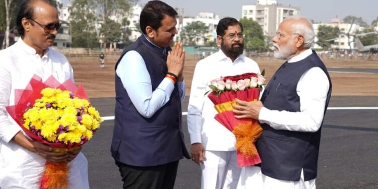 नाशिक | २७ व्या राष्ट्रीय युवा महोत्सवाच्या उद्घाटन कार्यक्रमासाठी पंतप्रधान Narendra Modi यांचे निलगिरी बाग येथील हेलिपॅडवर आगमन झाले. मुख्यमंत्री Eknath Shinde – एकनाथ संभाजी शिंदे , उपमुख्यमंत्री देवेंद्र फडणवीस, उपमुख्यमंत्री अजित पवार यांनी पुष्पगुच्छ देऊन पंतप्रधानांचे स्वागत केले.