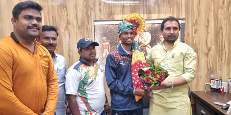 आंतरराष्ट्रीय धनुर्विद्या स्पर्धेसाठी निवड झालेल्या देशातून साईराज हणमे यांची निवड राष्ट्रवादीच्या वतीने जिल्हाध्यक्ष संतोष पवार यांनी फेटा पुष्पगुच्छ देऊन सन्मान केला.चीन तायपे येथे होणाऱ्या आंतरराष्ट्रीय धनुर्विद्या स्पर्धेत ‘साईराज’ तू नक्कीच विजयी होशील..! अशा शुभेच्छा यावेळी त्यांनी दिल्या.