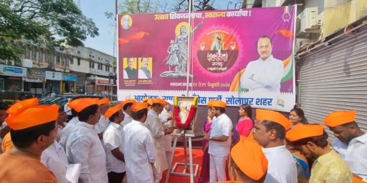 युगपुरुष छत्रपती शिवाजी महाराजयांच्या जयंती निमित्त राष्ट्रवादीचे राष्ट्रीय अध्यक्ष अजितदादा पवार ,प्रदेशाध्यक्ष खा. सुनील तटकरे यांच्या संकल्पनेतून 12 फेब्रुवारी ते 19 फेब्रुवारीपर्यंत साजरा होणाऱ्या स्वराज सप्ताहाचा शुभारंभ प्रसंगी प्रथमतः छत्रपती शिवाजी महाराज यांच्या प्रतिमेस माजी आमदार रविकांत पाटील यांच्या शुभहस्ते पुष्पहार अर्पण करून छञपती शिवाजी महाराज यांची आरती गाऊन वंदन करण्यात आले .