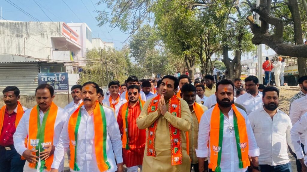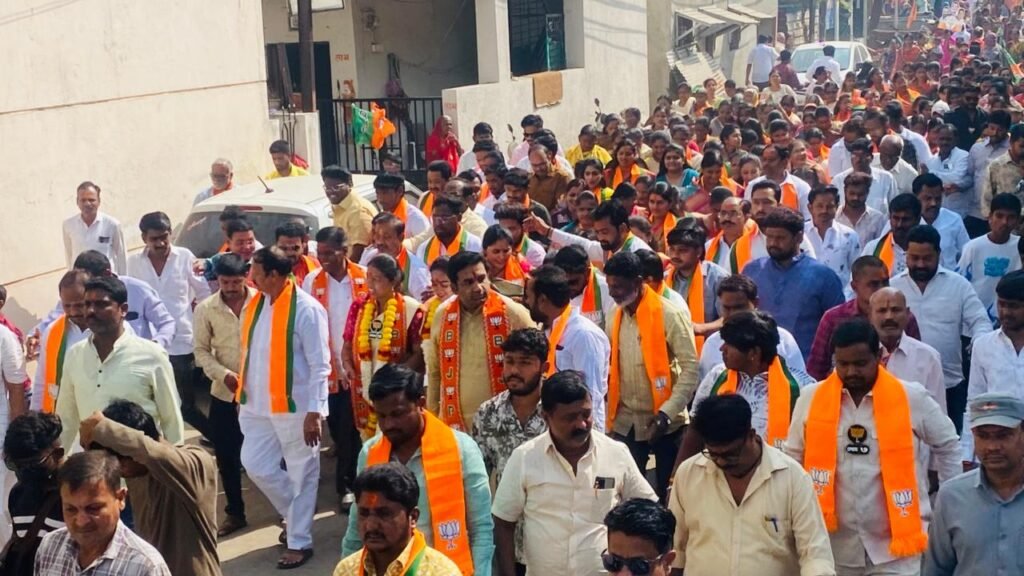 पारंपारिक ढोल ताशे, हलग्यांचा कडकडाट, हाती भाजपाचे झेंडे, गळ्यात भाजपाचे शेले, ‘भारतमाता की जय’, ‘जय श्रीराम’, ‘भारतीय जनता पार्टीचा विजय असो’ च्या घोषणांमुळे प्रभाग क्रमांक ७ परिसर भाजपमय झाल्याचे चित्र पहायला मिळाले. यावेळी कार्यकर्त्यांनी पालकमंत्री जयकुमार गोरे, आमदार विजयकुमार देशमुख, आमदार देवेंद्र कोठे, शहराध्यक्षा रोहिणी तडवळकर यांच्या छबी असलेले फलक धरले होते.