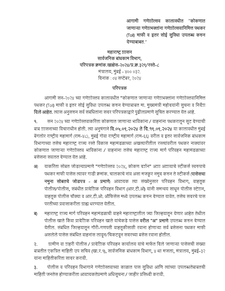 गणेशोत्सवासाठी कोकणात जाणाऱ्या गणेशभक्तांना टोलमाफीसह अन्य सोई सुविधा उपलब्ध करुन देण्याचे निर्देश मुख्यमंत्र्यांनी दि.१४ ऑगस्ट रोजी झालेल्या गणेशोत्सव पूर्वतयारी आढावा बैठकीत सार्वजनिक बांधकाम विभागाला दिले होते, त्यानुसार आज सार्वजनिक बांधकाम विभागाने पथकर सवलतीचा शासन निर्णय जारी केला आहे.